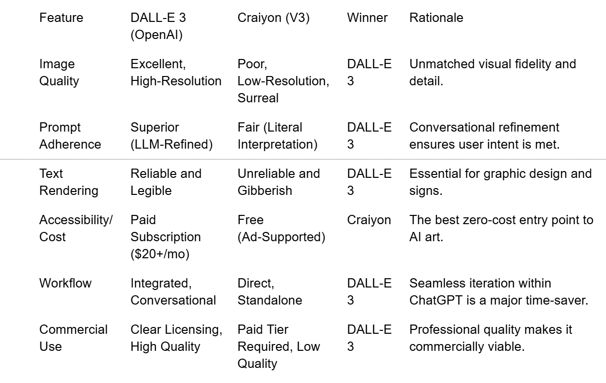 The difference in output format highlights the core market for each tool: Craiyon is for quick, exploratory, and often humorous generation, while DALL-E 3 is for focused, high-stakes creation where quality is paramount.