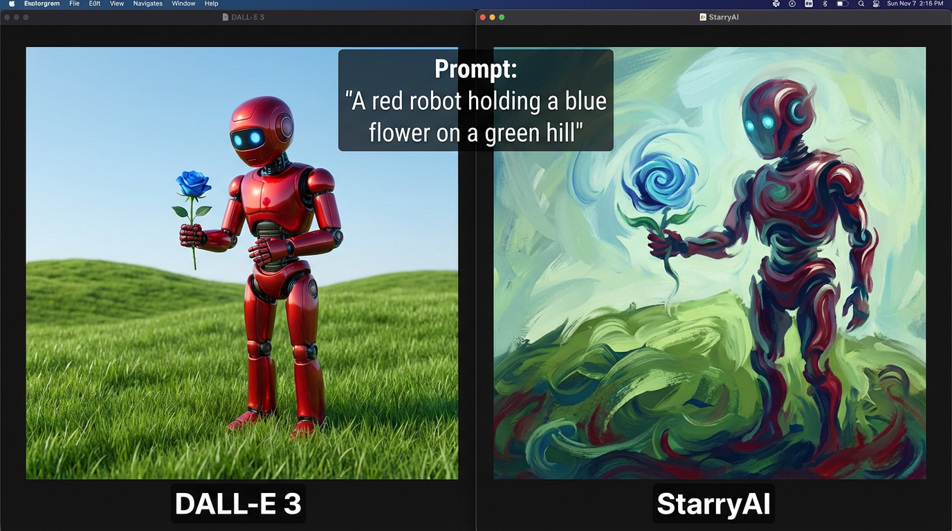 A visual comparison of DALL-E 3's literal interpretation versus StarryAI's artistic, stylized interpretation of the same complex prompt, highlighting the core difference in output philosophy.