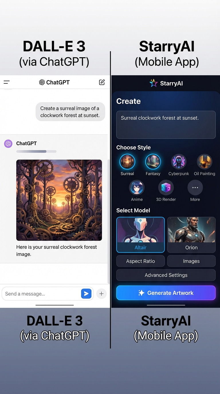 A side-by-side view of the DALL-E 3 conversational interface (via ChatGPT) and the StarryAI mobile app interface, illustrating the difference between a dialogue-based and a dedicated, structured app workflow.