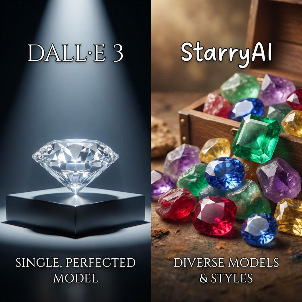 This difference is crucial: DALL-E 3 offers the cutting edge of a single, highly refined technology, while StarryAI offers the breadth and flexibility of the entire open-source ecosystem, packaged for ease of use.