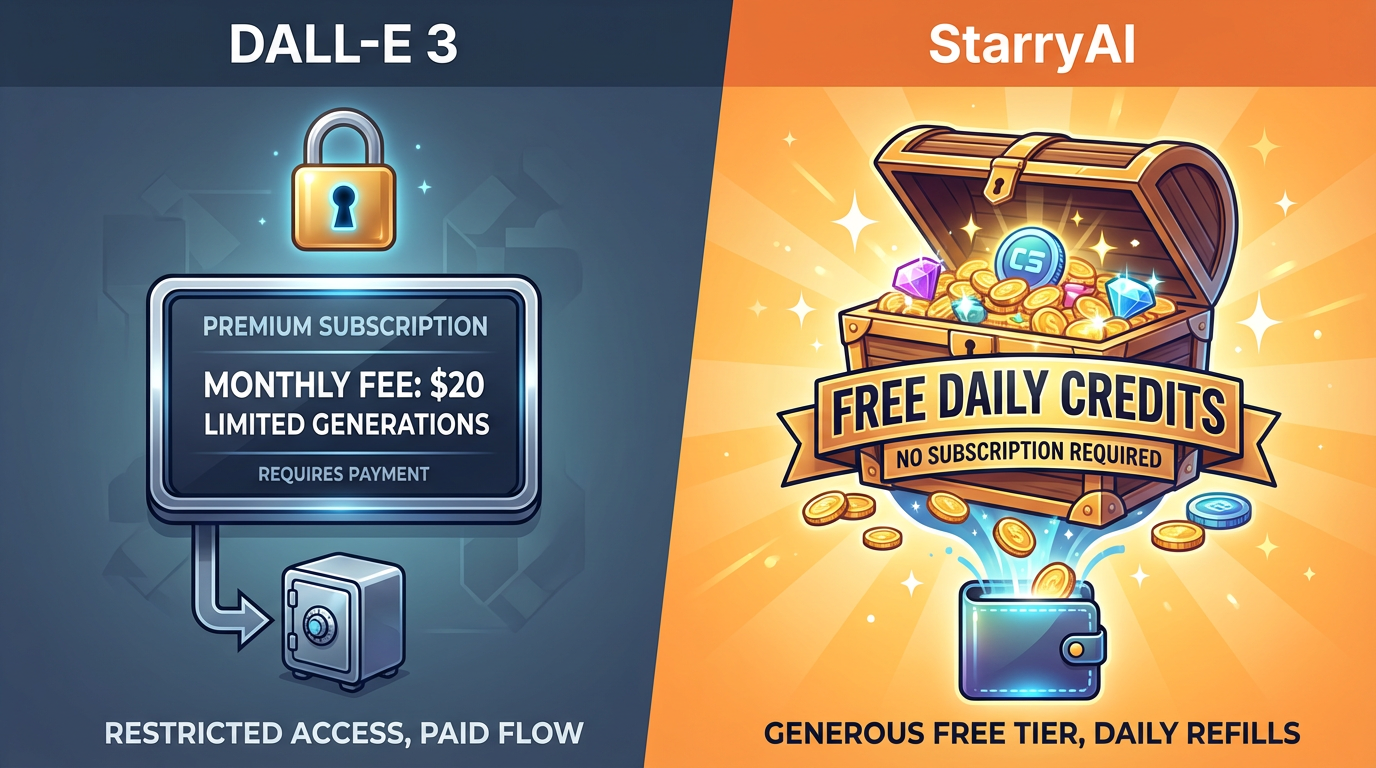 A visual comparing DALL-E 3's premium, subscription-based access (locked box) with StarryAI's generous free tier and credit system (open treasure chest).