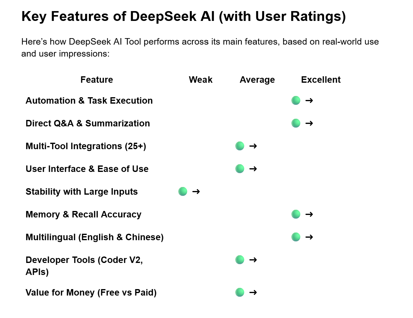 DeepSeek AI excels at handling structured workflows, from résumé screening to report drafting, making it one of the strongest AI productivity assistants in its class. - Direct Q&A & Summarization → Excellent