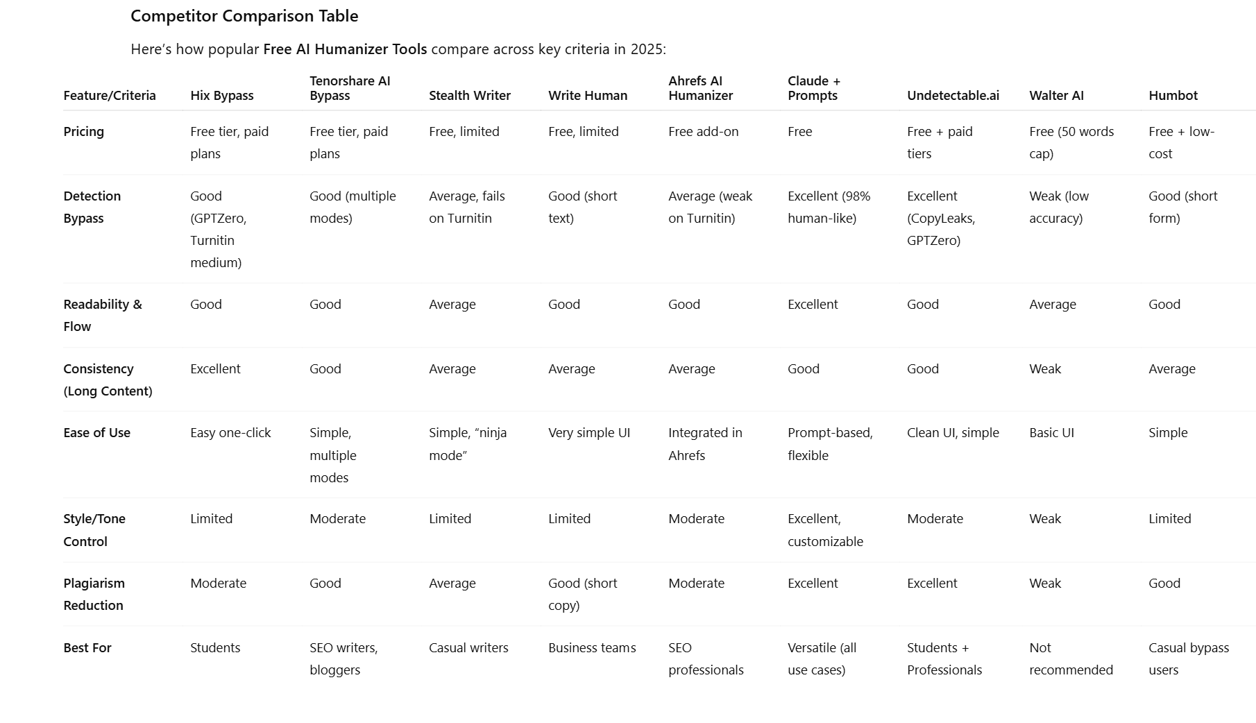Through my own testing, I’ve seen that not all tools are created equal. Some produce content that feels convincingly natural, while others merely reshuffle words without fixing the “AI footprint.” Here’s a deeper dive into each tool, including pros, cons, and which audience benefits most.