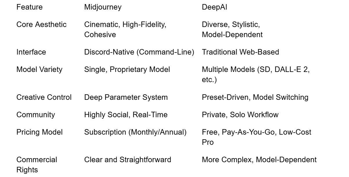 The choice between Midjourney vs DeepAI boils down to a fundamental question: Do you prioritize unparalleled aesthetic quality and community or model variety and accessibility?