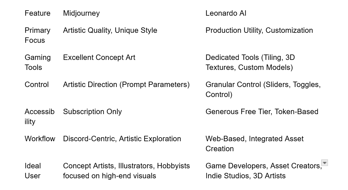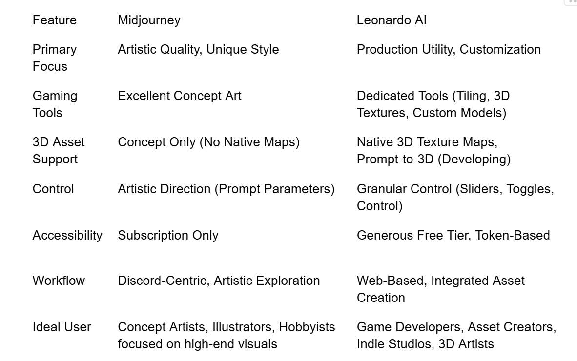 For the game developer, the current state of the Midjourney vs Leonardo AI debate is a win-win. They have access to the best artistic concept generator (Midjourney ) and the most feature-rich asset production tool (Leonardo AI). The key is understanding when to use each tool to maximize the efficiency and quality of their creative pipeline. The future will belong to the tool that can most effectively bridge the gap between stunning artistic vision and seamless, production-ready utility.