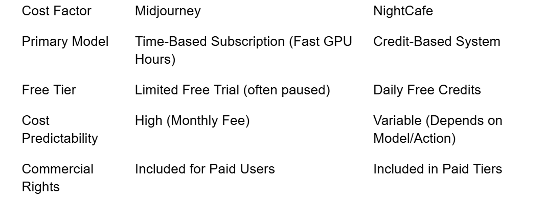 •Selling Art and Direct Monetization: NightCafe features a built-in marketplace where users can sell their creations as prints or digital assets, providing a direct, integrated path to monetization that is a key differentiator from Midjourney's core offering . This makes NightCafe a more attractive option for artists looking to immediately turn their AI creations into a source of income.