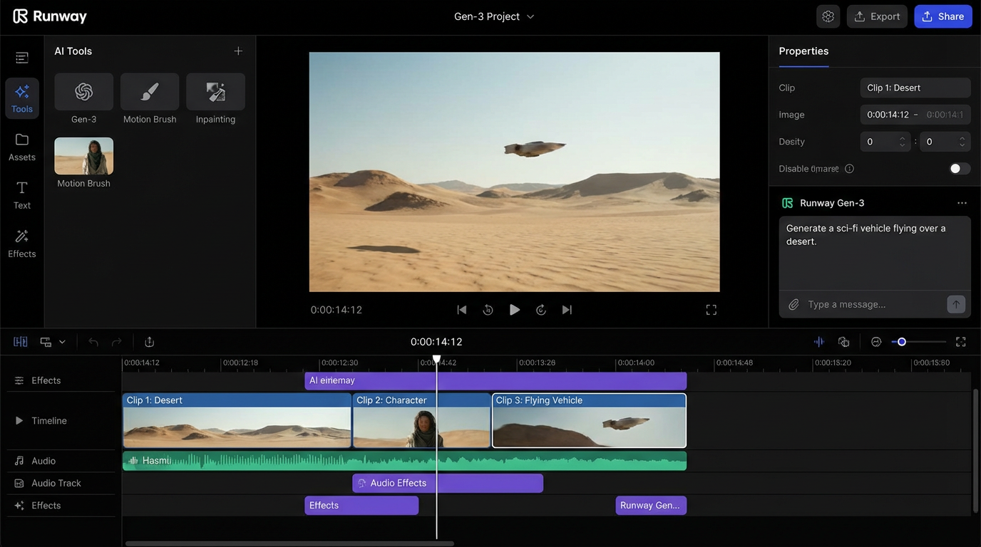 •Audio Integration: Runway offers tools for generating and integrating sound effects and music, making it a more complete solution for final video output compared to Veo, which often requires external audio processing.