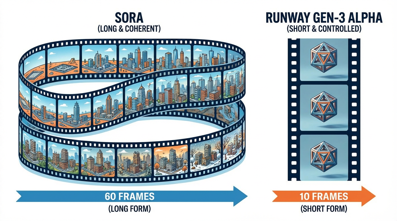A visual representation of video length and coherence. The left side shows a long film strip (60 frames visible) with a complex, evolving scene that remains temporally consistent (Sora). The right side shows a short film strip (10 frames visible) with a single, perfectly controlled camera movement (Runway Gen-3 Alpha).