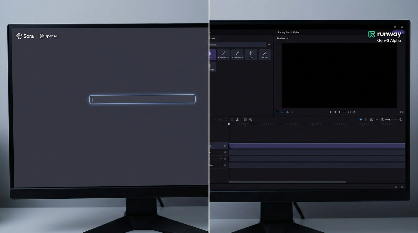 A side-by-side comparison of two interfaces. The left side shows a minimalist, clean interface with a single prompt box and a small OpenAI logo (Sora). The right side shows a complex, professional video editing suite interface with multiple tracks, tool icons (like Motion Brush), and the Runway logo (Gen-3 Alpha).