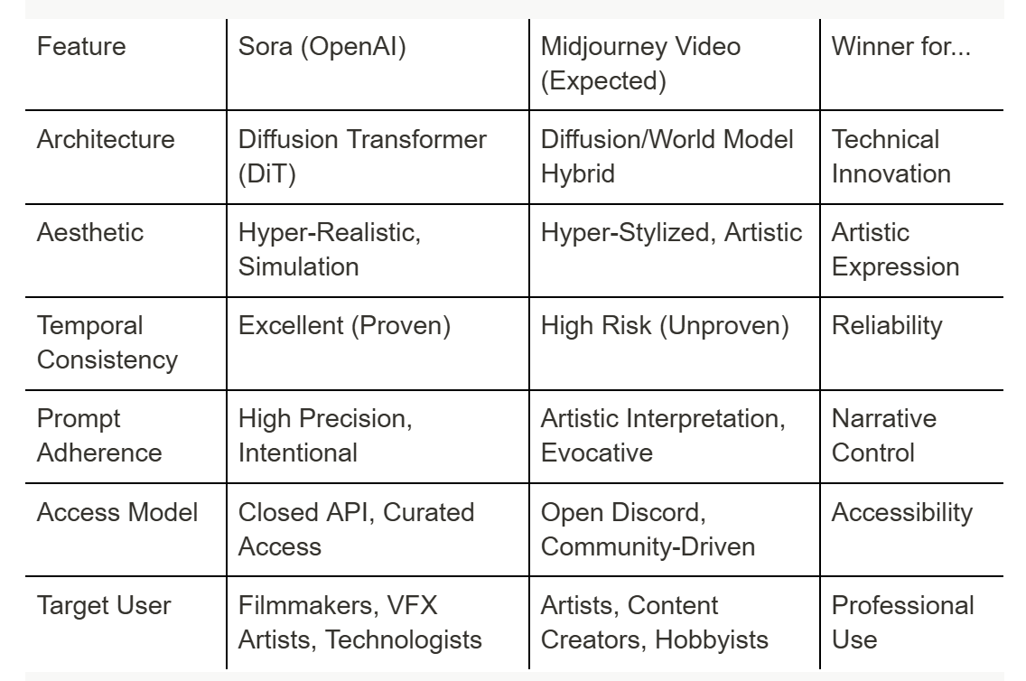- Potential Weakness: If Midjourney relies too heavily on a traditional diffusion architecture, it may initially struggle with the temporal consistency that Sora has mastered, leading to shorter, less complex clips.