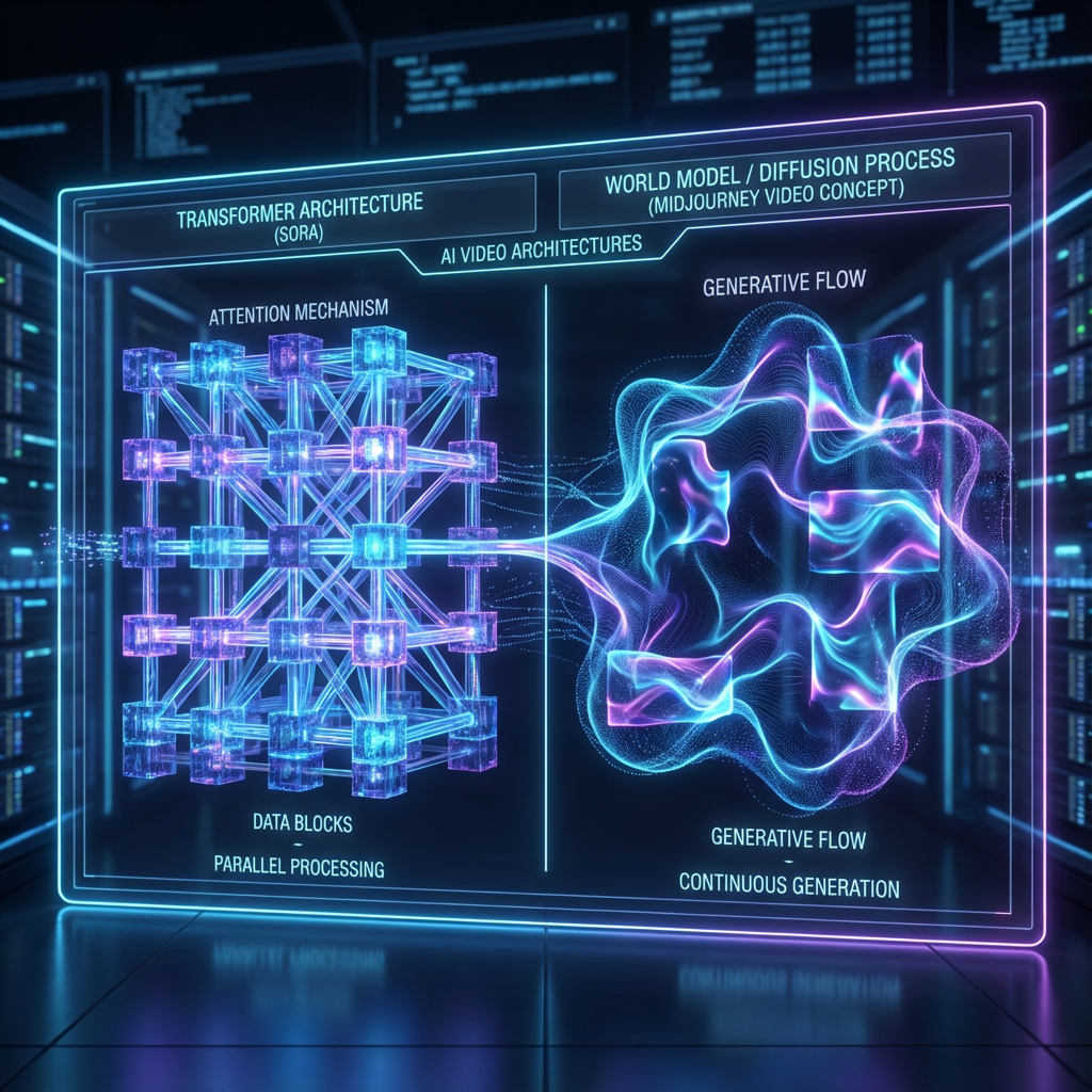 A visual metaphor for two different AI video architectures. On the left, a complex, interconnected grid of data blocks representing a Transformer model (Sora). On the right, a swirling, organic cloud of light and color representing a World Model/Diffusion process (Midjourney Video concept). Futuristic, neon blue and purple color scheme.
