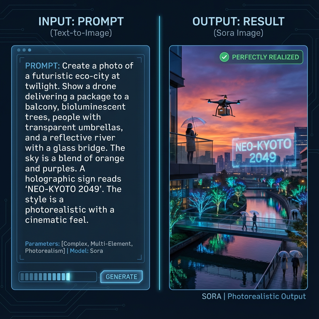 A visual showing a complex, multi-element text prompt being perfectly realized. A split image where the left side shows a detailed text box (the prompt) and the right side shows the resulting image with every element present and correct (Sora). Clean, UI-focused design.
