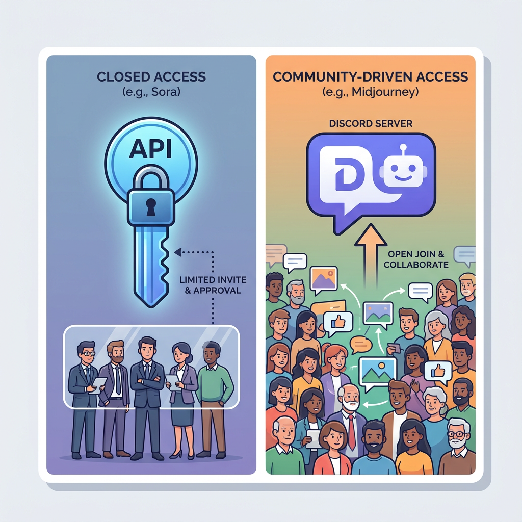 A visual comparing two different access workflows. On the left, a single, locked API key icon with a small, exclusive group of people (Sora's closed access). On the right, a large, open Discord server icon with a crowd of users collaborating (Midjourney's community-driven access). Modern, flat design.