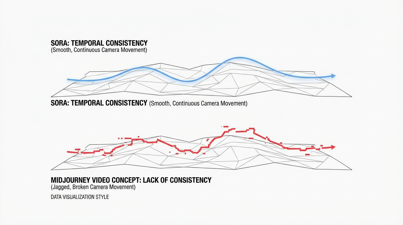 A visual representation of temporal consistency in video. A long, smooth, continuous line representing a camera movement across a landscape (Sora). Below it, a similar line with small, jagged breaks or glitches, representing a lack of temporal consistency (Midjourney Video concept). Minimalist, data visualization style.